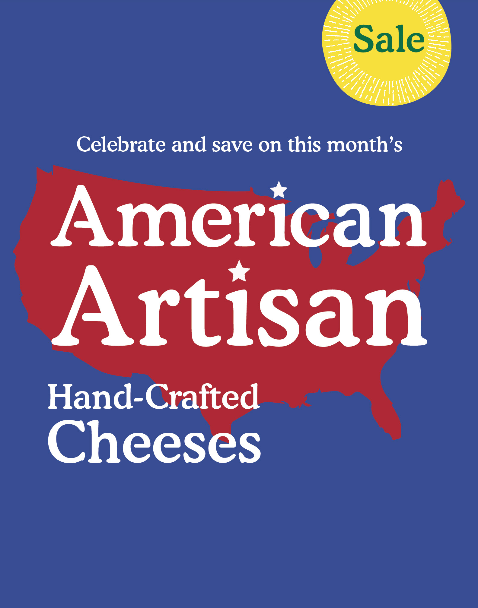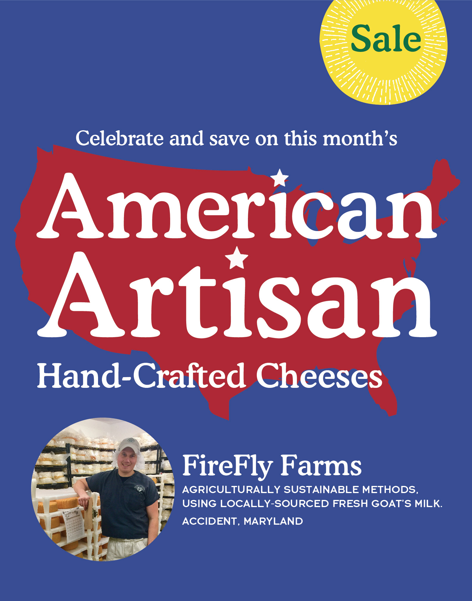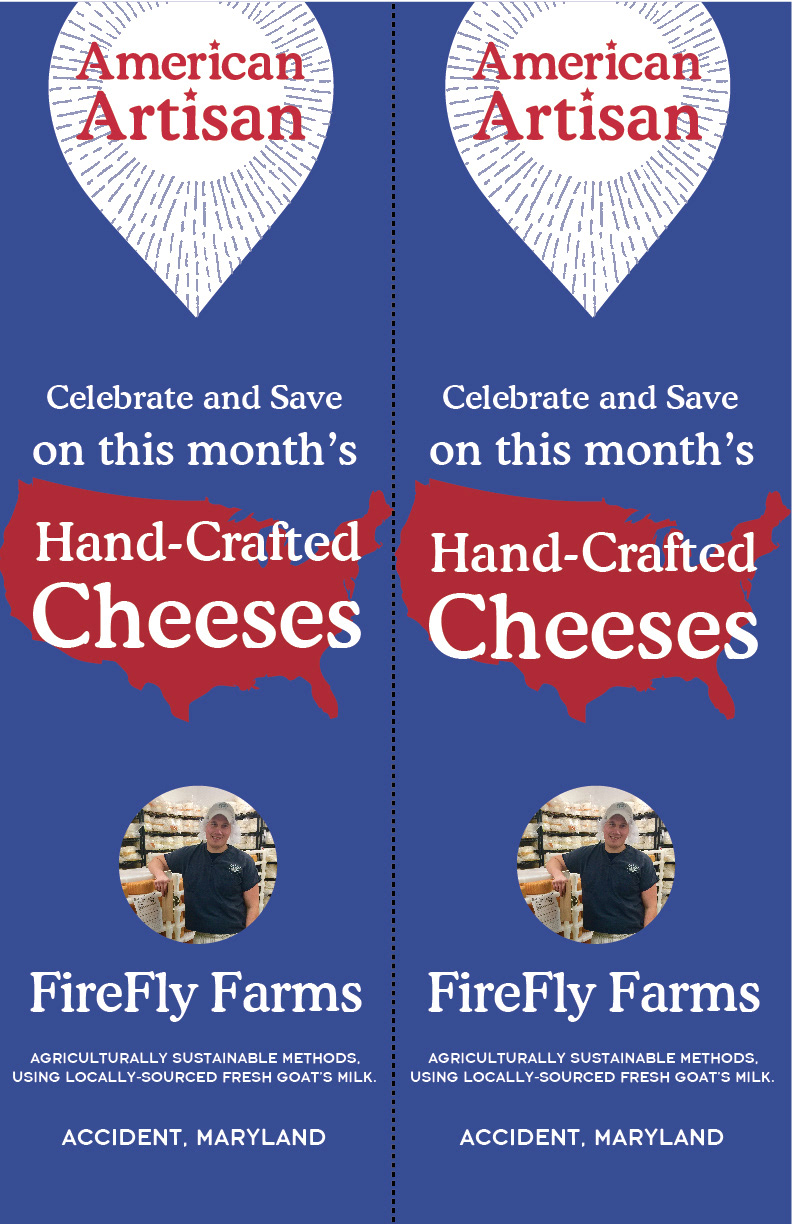 American Artisan is a year long program, exclusive to the Florida region, where every month a select artisan is featured and promoted. On this project I worked closely with our Specialty Regional team, Creative Director and Marketing Associate Coordinator. Program assets were designed to fit every 3 different cheese displays throughout the Florida region stores.
